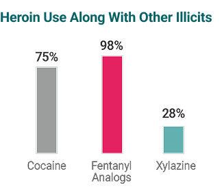 A majority of heroin samples also test positive for other substances, most commonly fentanyl analogs and cocaine, reflecting a growing trend of polysubstance use.